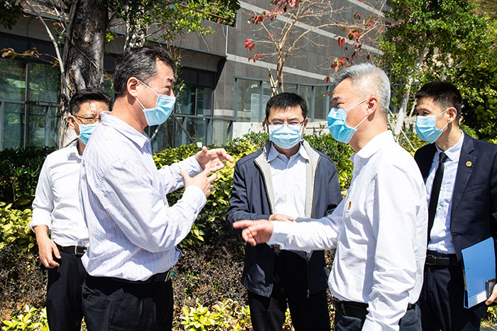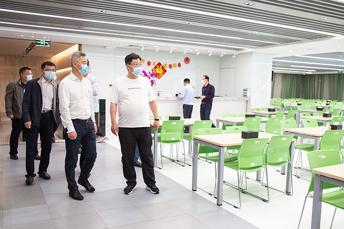 杨军区长一行先后来到中兴发展总部、员工餐厅、中兴和泰海景酒店等场地,查看了中兴发展的消毒防疫、人员进出检查、员工工作及用餐等情况,并耐心了解了企业的经营情况,就防疫及复产复工过程中存在的困难进行了解。